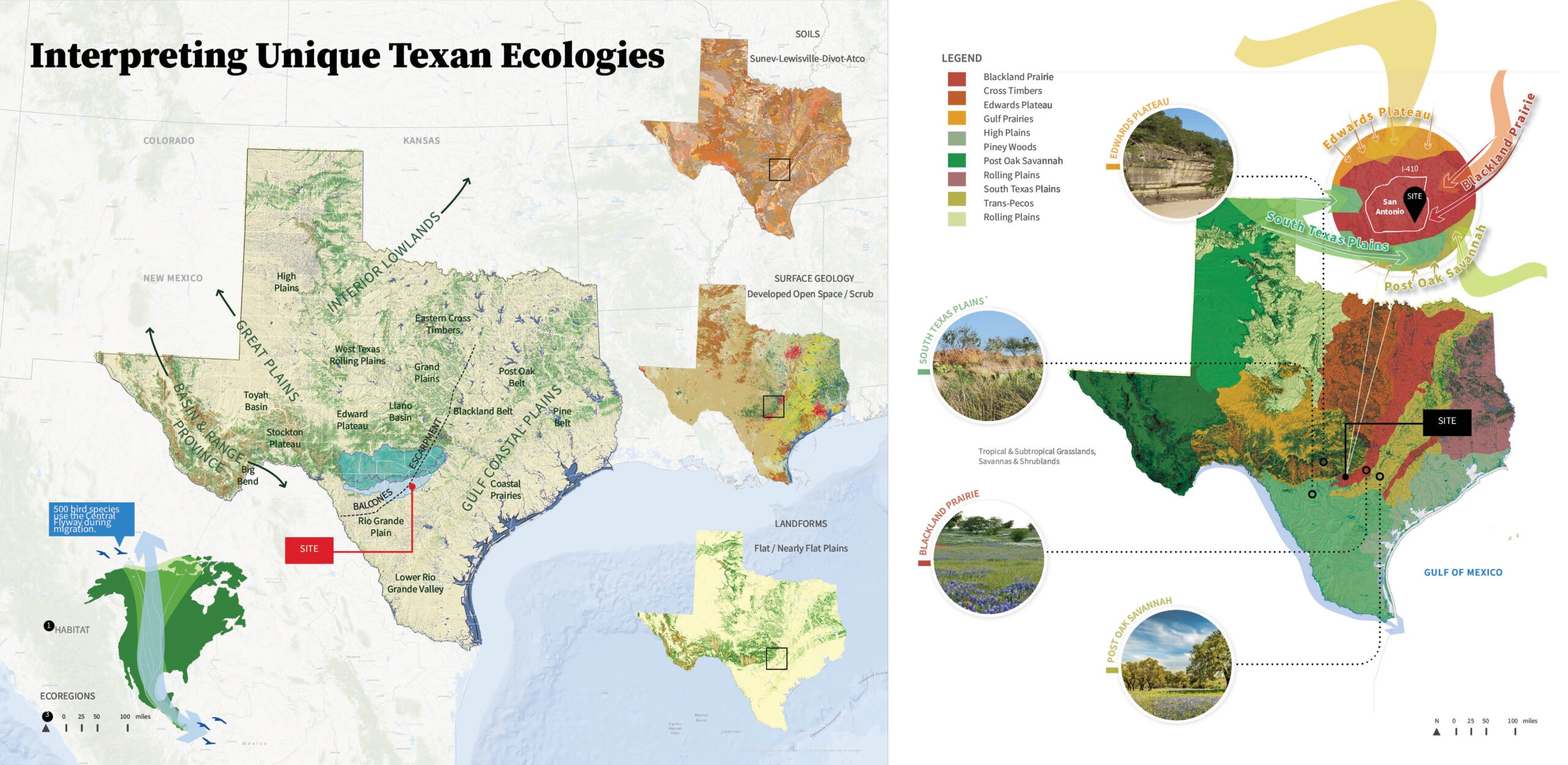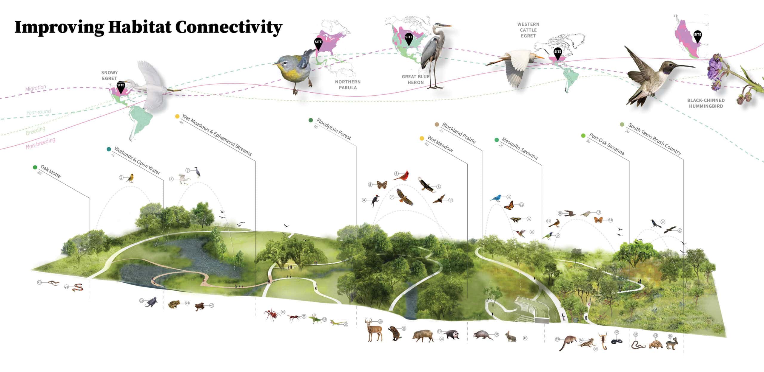 The Arboretum’s design is shaped by the site’s unique ecological location—straddling the Balcones Escarpment Fault Line and within the Edwards Aquifer—it sits at the intersection of multiple ecoregions, making it a prime location to showcase Texas’s ecological diversity. Open fairways and remnant forests are reminders of the Blackland Prairie’s deep, fertile soils and the open landscape of the Post Oak Savannah. Through rigorous GIS analysis and field surveys, the design team documented existing flora and fauna, mapped historic habitat types, and identified critical features such as red harvester ant colonies—an indicator of healthy, undisturbed soils.