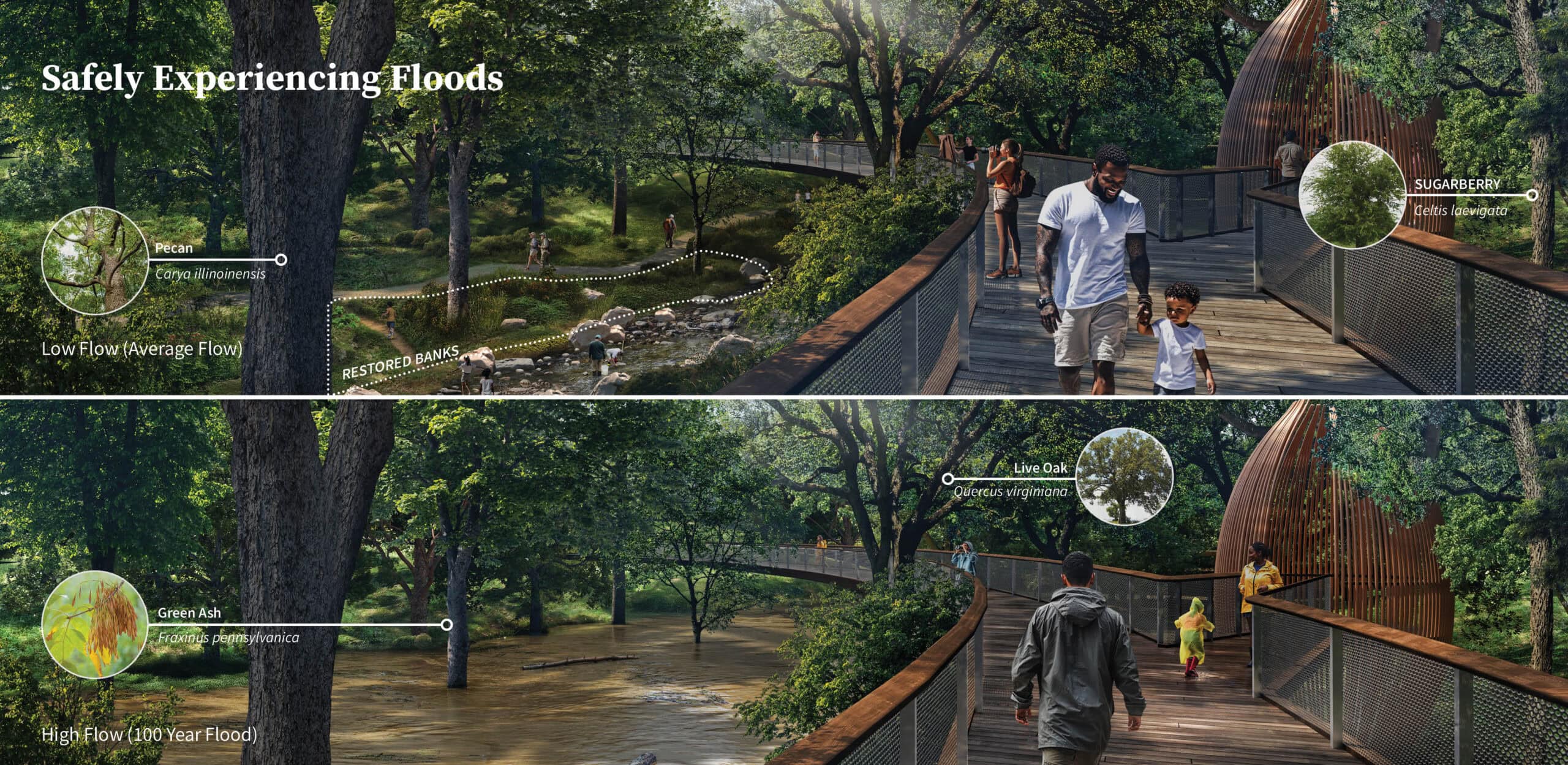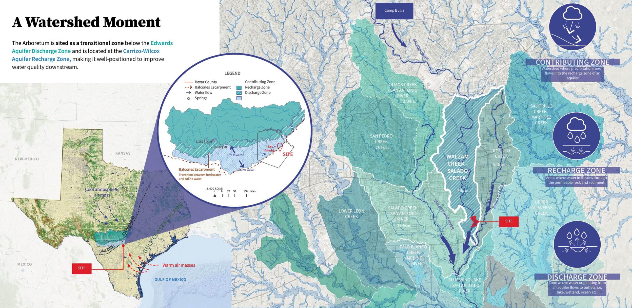 Water systems play a major role in the Arboretum’s function and design. More than 80% of the site lies within the 100- and 500-year floodplain of Salado Creek. This geography allows the Arboretum to act as a natural stormwater filter for nearby neighborhoods and commercial zones. The floodplain and 1.5-mile stretch of Salado Creek were meticulously studied in partnership with the San Antonio River Association to assess erosion, sedimentation, and debris collection. With up to 35’ elevation in creek crests, analysis and flood safety informed the location of trails and buildings, and led to the design of the community-favorite Canopy Walk–a safe, elevated and accessible path through flood-prone areas, offering unique views of mature creekside trees.
