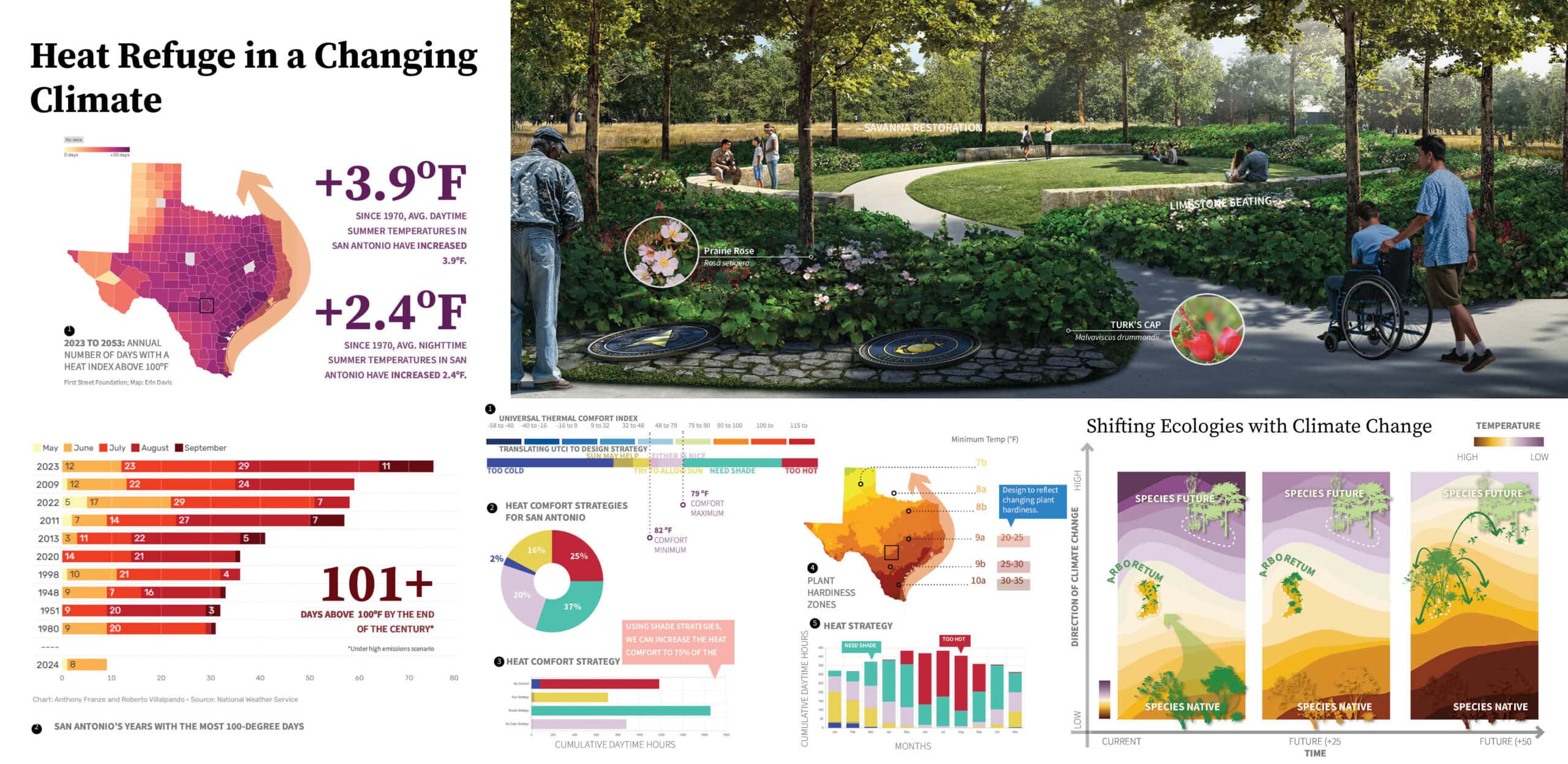 The Arboretum is designed as a vital urban heat refuge. Using a Universal Thermal Climate Index (UTCI) model, the plan incorporates multiple cooling strategies, including shaded areas beneath mature trees, interactive water features, low-albedo materials, shaded pavilions, and indoor climate-controlled spaces. These features will provide essential cooling and climate resilience for nearby communities.