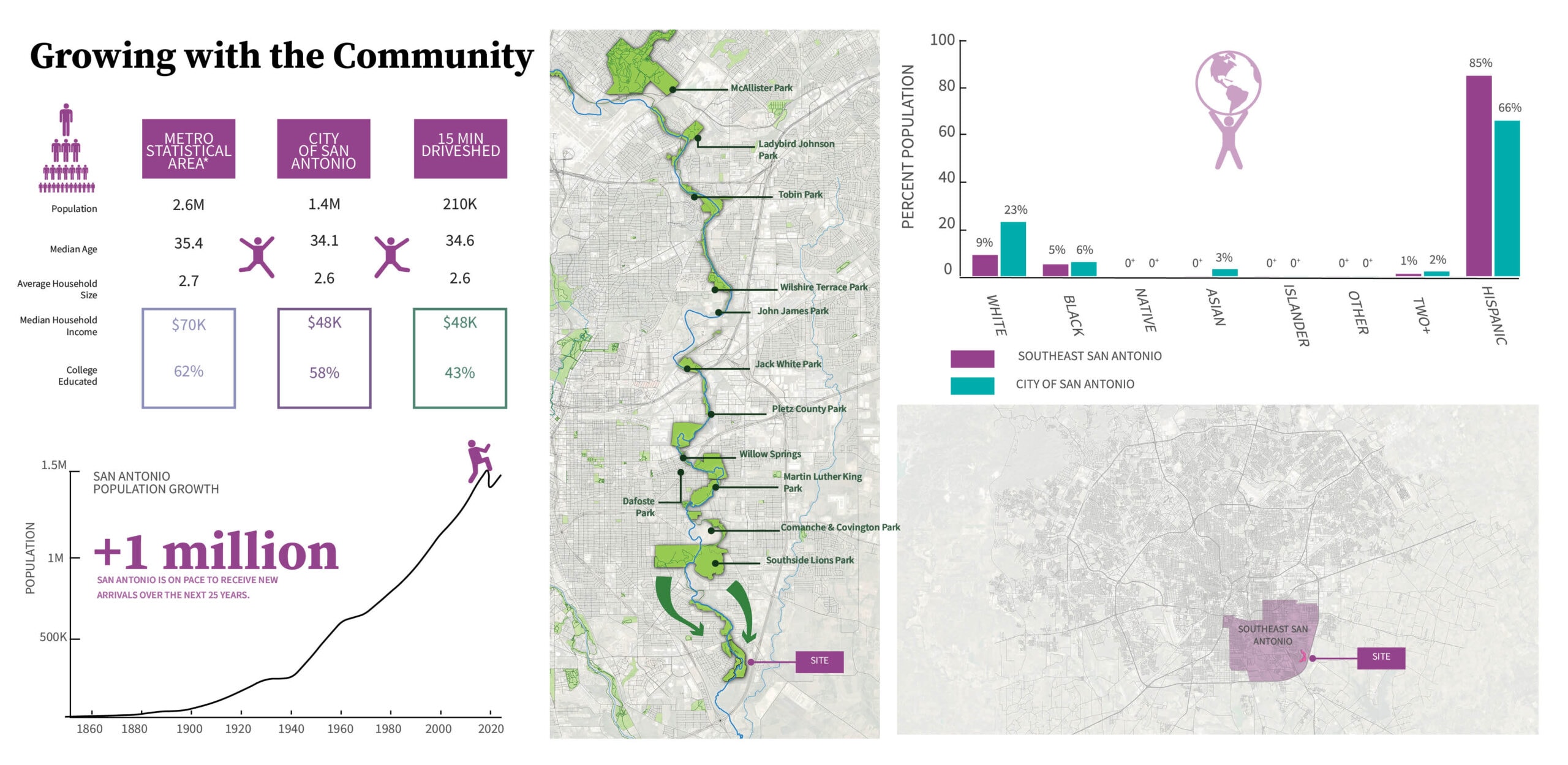 San Antonio is ranked as the seventh-largest rapidly growing city in the United States, with a population exceeding 1.4 million. As the city grows, so does the need to preserve green space for ecosystem services and nature education. The Arboretum addresses this need, especially for historically underserved neighborhoods in southeast San Antonio, many of which are predominantly Hispanic and lack equitable access to high-quality parks. The site’s integration into the broader Howard W. Peak Greenway system will connect over 25 miles of parks along Salado Creek, increasing bike access to high-quality, free green spaces across San Antonio.