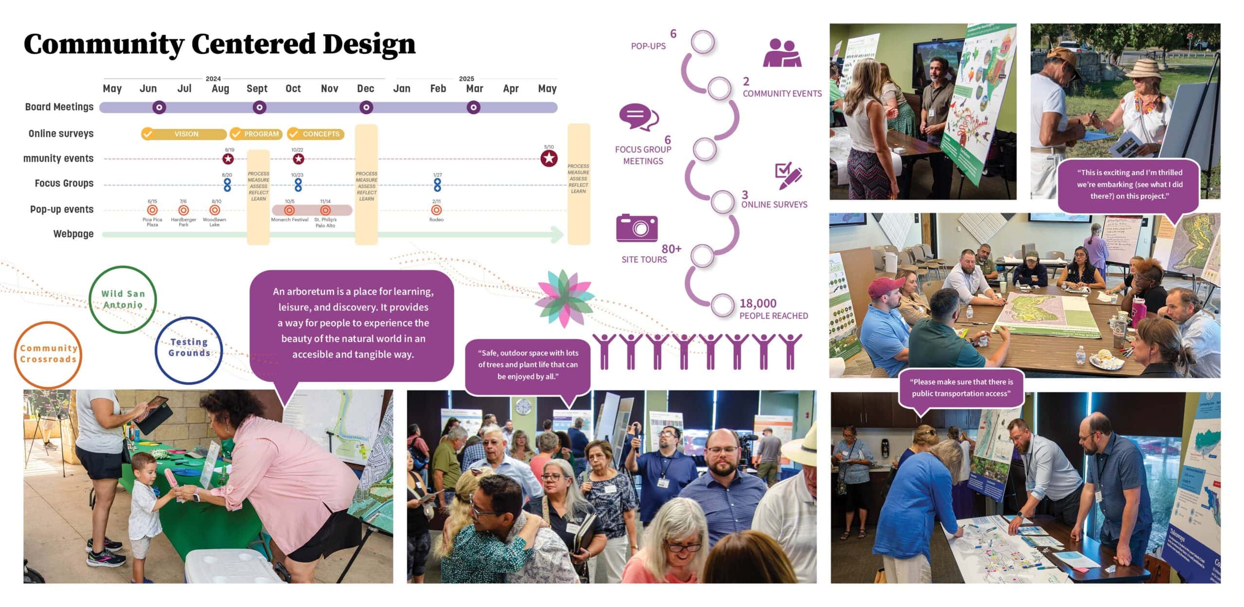 Community engagement has shaped the Arboretum’s development. The planning team used a variety of outreach methods to gather input from residents and stakeholders, adjusting techniques to ensure demographic representation of southeast San Antonio. Three large community events were held at key milestones, which allowed attendees of all ages to share their preferences for the site’s design, including highlighting indigenous history, water stewardship, and a desire for a canopy walk. Four multilingual online surveys collected feedback on community aspirations and design concepts, with “Wild San Antonio’s” nature-based experiences receiving the most votes. Six pop-up events reached people across the city and gathered additional input. Two focus groups composed of community leaders with expertise in the environment and local culture met five times to provide detailed feedback on implementation and partnerships. Printed, televised, and website news articles highlighting the design steps helped drive participation and interest. In total, over 18,000 people were engaged, ensuring that the Arboretum reflects the community’s needs and aspirations.