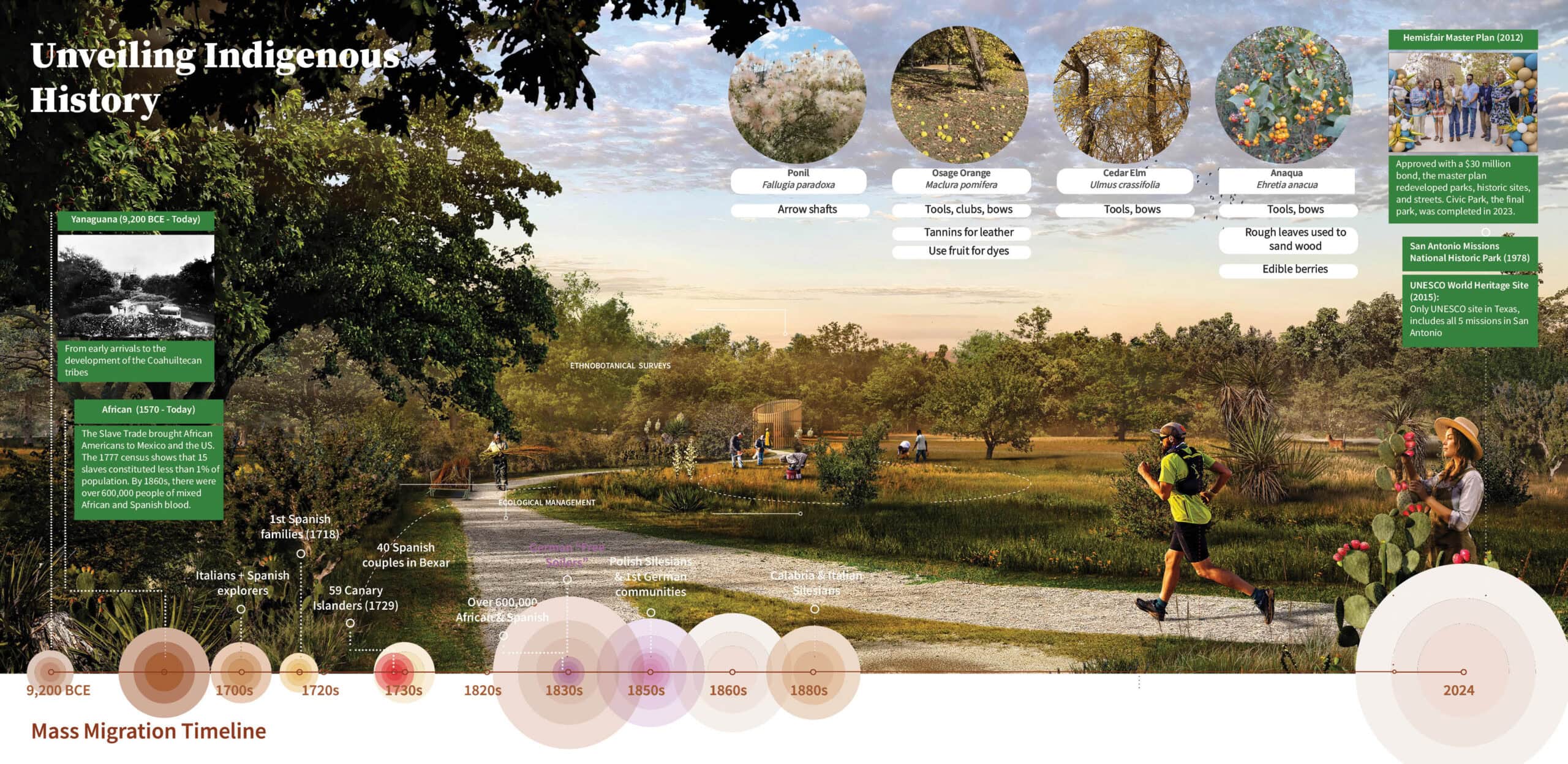 Cultural heritage—particularly Indigenous histories—is a core element of the Arboretum prioritized by community input. The area is known as ‘Yanaguana’ by Coahuiltecan-speaking peoples, who long used the region’s waterways for travel, trade, and settlement. The site contains Paleo-Indian archaeological features and a historical battle marker, informing both preservation efforts and interpretive programming.
