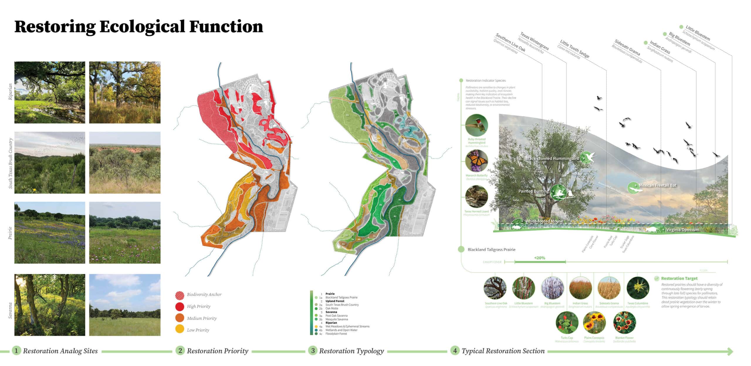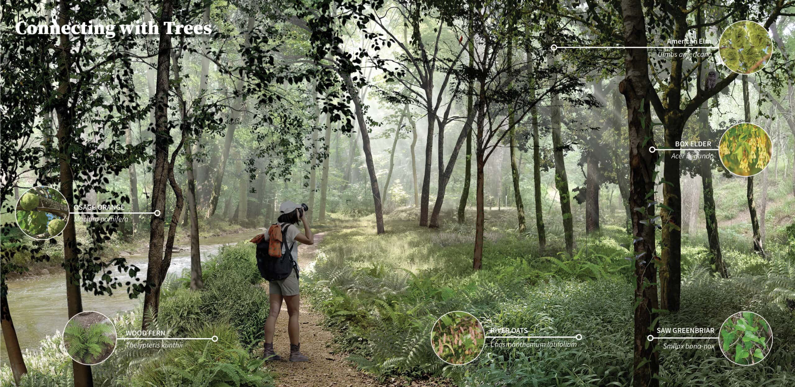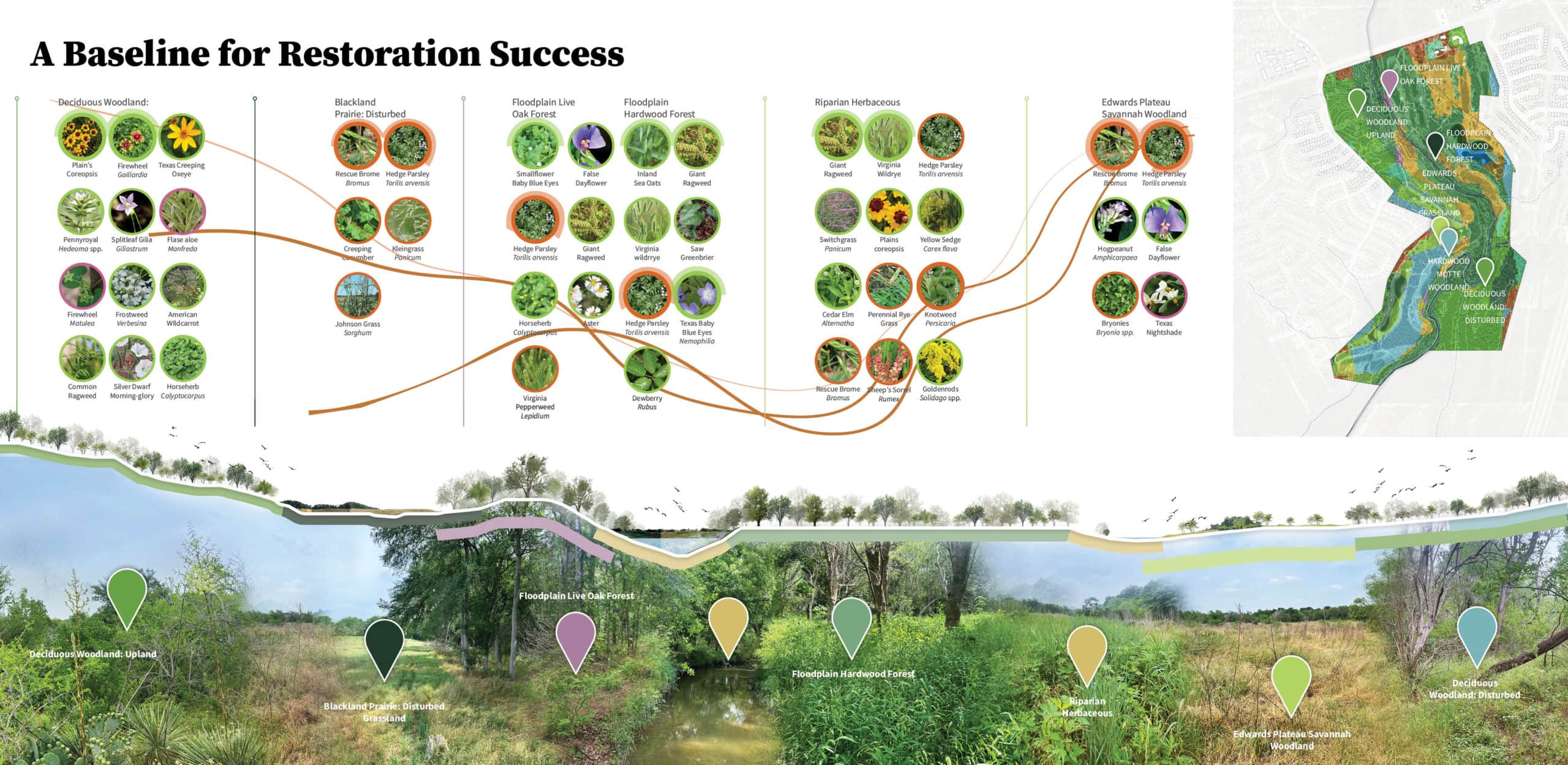 Restoration and land stewardship are fundamental to the Arboretum’s mission and to interpreting and preserving the region’s rich biodiversity. Historically, the site supported fourteen habitat types, due to the convergence of four ecoregions. These are well represented in riparian, upland, and transitional landscapes found across the Arboretum. Despite decades of agricultural and golf course use, the presence of historical habitat types, historic trees, and a re-emerging seed bank suggests strong potential for restoration. Through floral survey transects, the team identified remnant plant species, creating a baseline that will be used in post-occupancy studies and citizen science research to measure restoration success. An Ecological Management Plan outlines strategies to support biodiversity, strengthen inter-species food webs, and manage invasive tree species. Management options also address local and indigenous practices to restore native plant and animal communities that have been impacted by feral hogs.