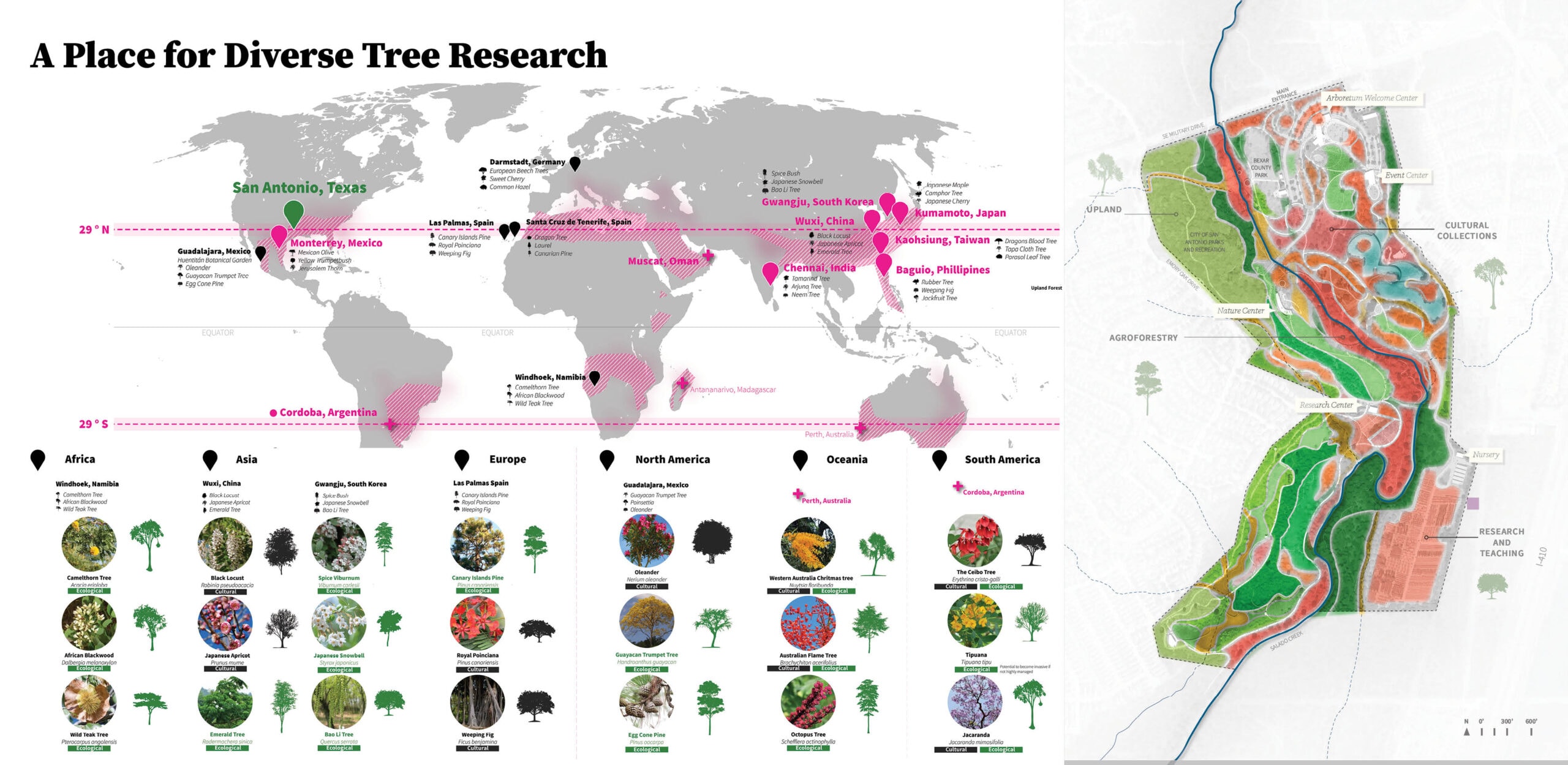 The planning process integrated rigorous site analysis, Indigenous and cultural research, and multilingual community engagement to inform a multi-pronged Master Plan. It includes a strategic plan, business plan, site design, ecological management plan, and operations and maintenance plan, setting the stage for holistic implementation. The design restores 13 native habitat types, enhances the Salado Creek corridor, and proposes climate-resilient planting strategies. The Arboretum includes botanical collections, education spaces, contemplative trails, and culturally responsive programming, serving as a public amenity and platform for environmental equity.