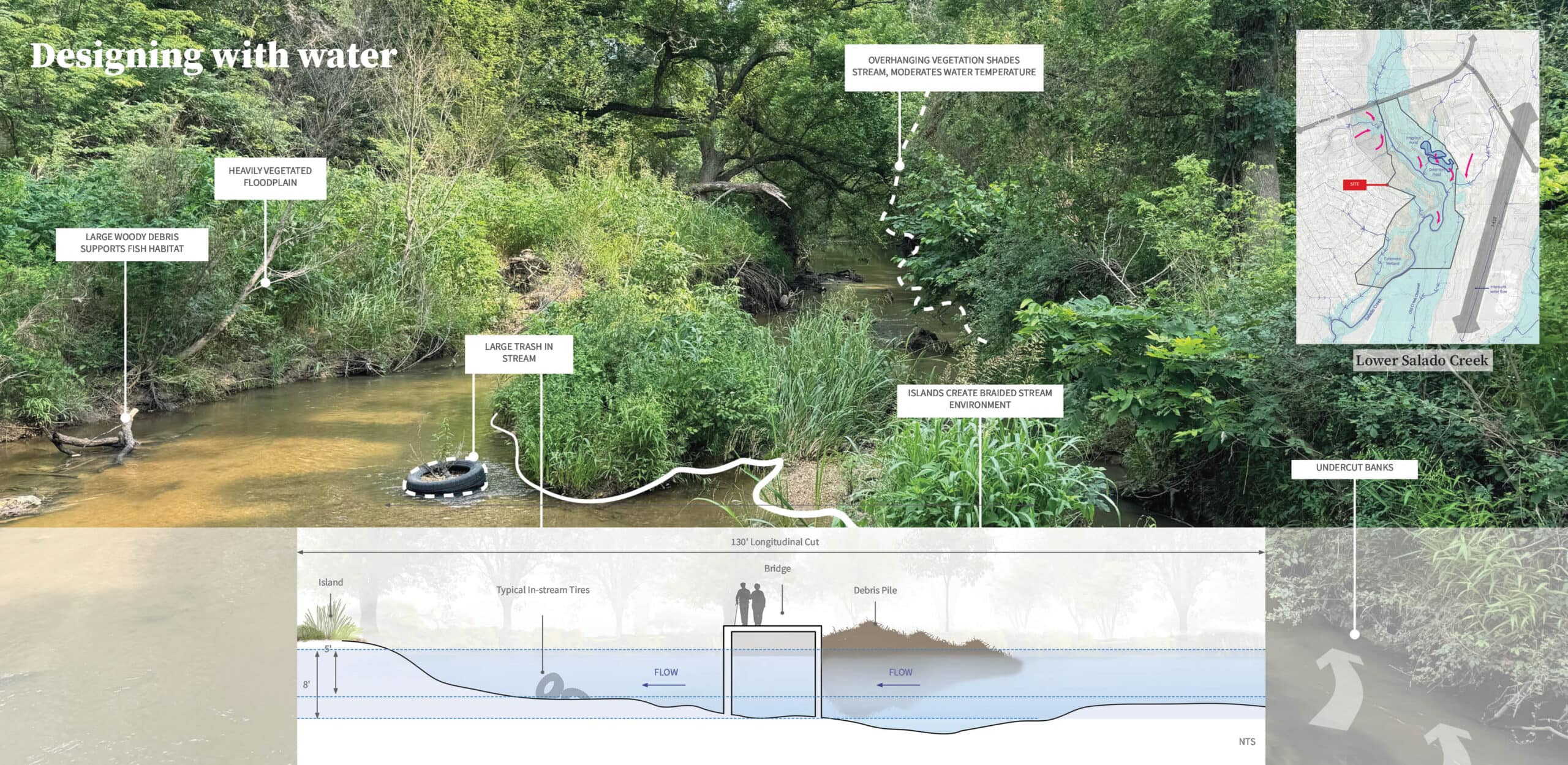 Stormwater best practices are integrated throughout the site, including bioswales, cisterns, and green roofs. A reimagined irrigation pond, fed by recycled water, has been expanded and linked with a wetland basin to create a larger system for filtration, detention, and irrigation reuse. Nearly one mile of restored tributaries feed into Salado Creek, with restored banks and newly formed wetlands supporting riparian biodiversity and groundwater recharge. These features improve water quality and also provide unique wetland experiences for visitors, showcasing plants and migrating waterfowl.