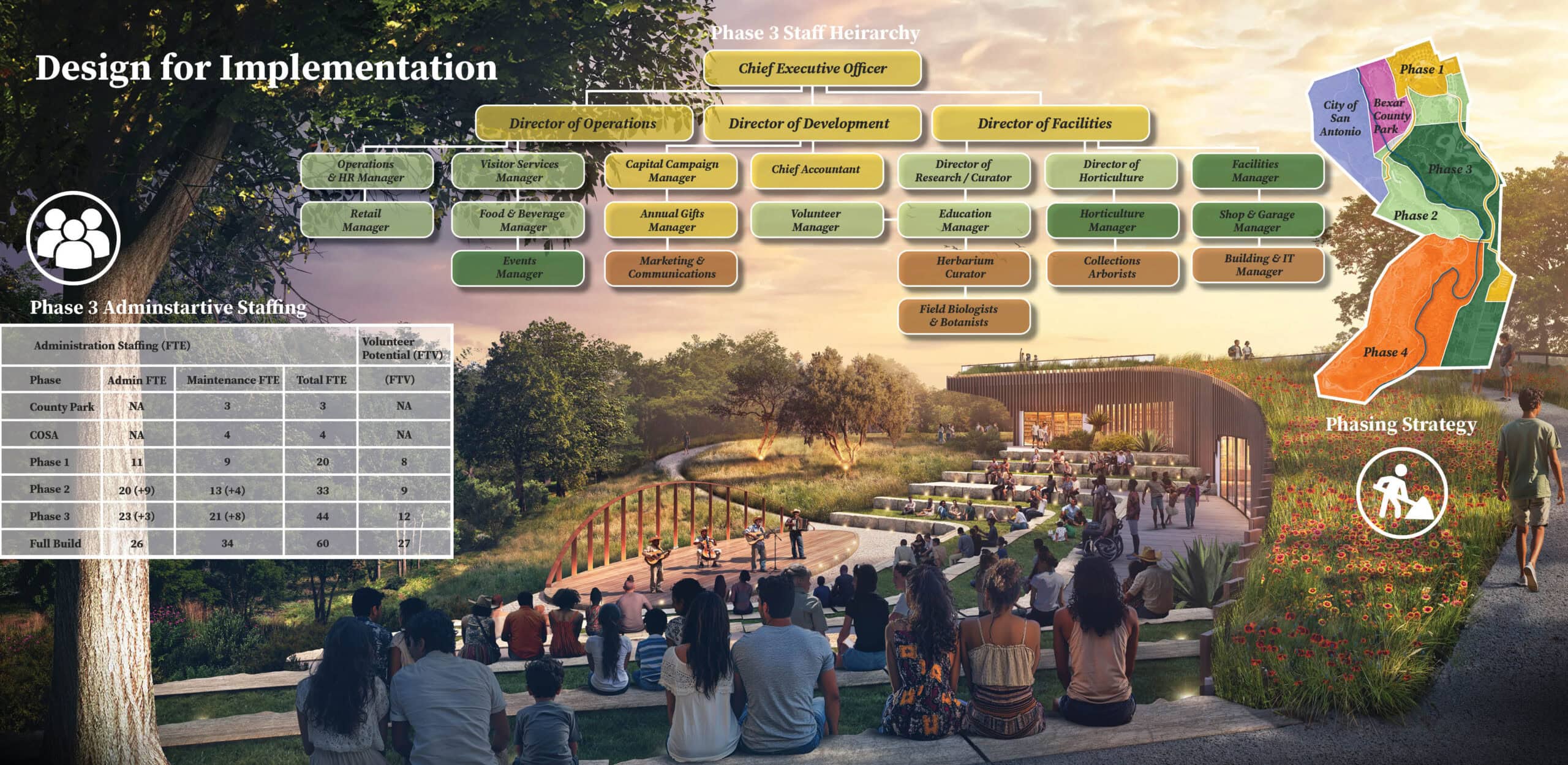 In addition to the Arboretum’s site plan, the design team developed a comprehensive Operations and Management plan, which outlines the project’s capital expenditures by phase, and links the Arboretum’s growth to staffing and equipment needs, as well as opportunities for earned revenue and potential partnerships. Informed by local experts and industry standards, the O&M plan sets forth a clear path for implementation, ensuring the arboretum will serve generations of San Antonians for years to come.