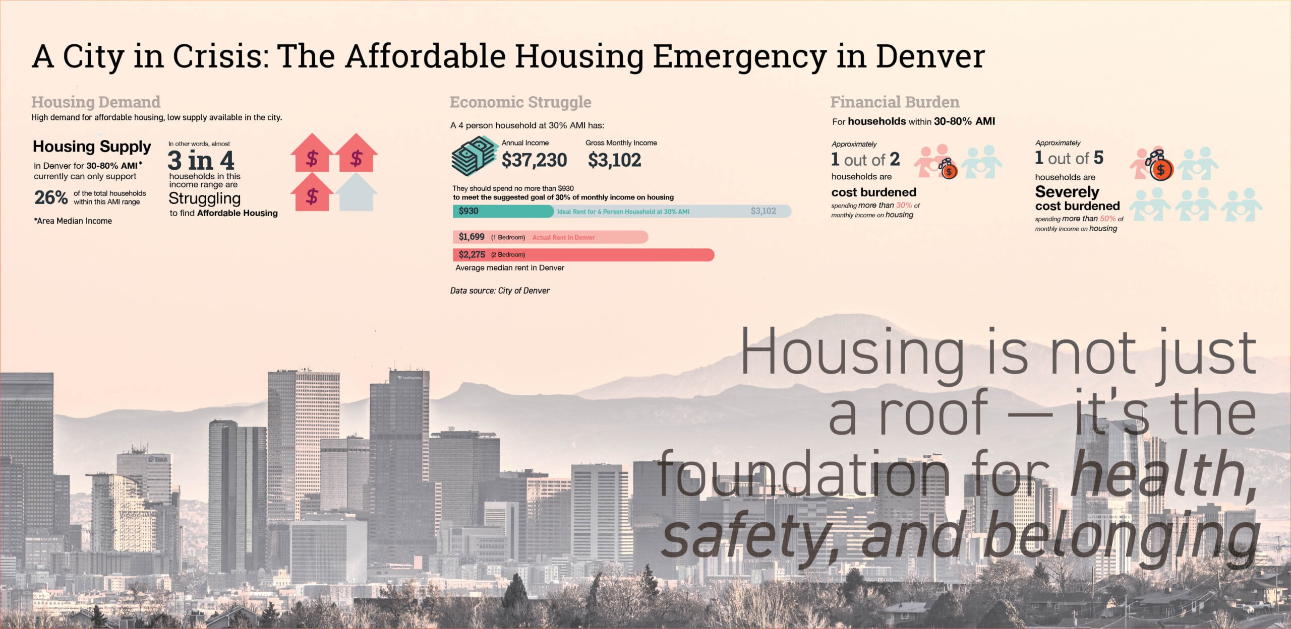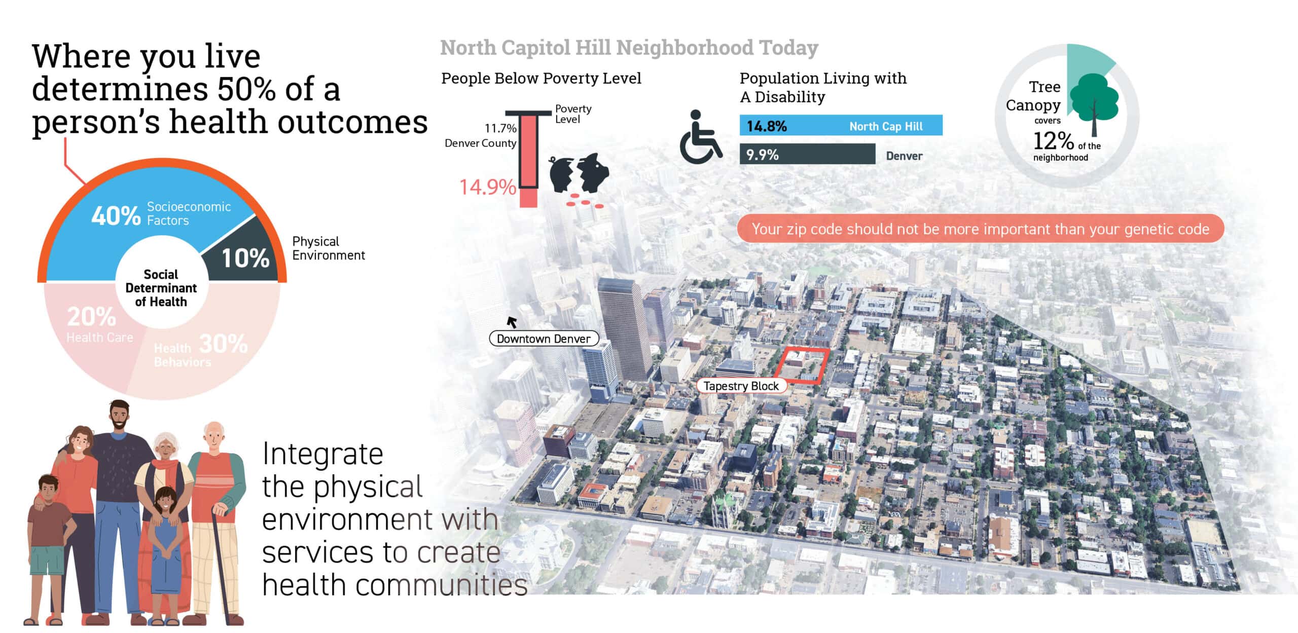 Located in Denver’s North Capitol Hill, a neighborhood experiencing rapid gentrification and displacement of working-class families, the Tapestry Block responds to multiple social and environmental challenges. While centrally located near hospitals, transit and major bike routes, the area lacks affordable, family-friendly housing, safe play spaces, and essential services such as childcare. Over 75% of households in the neighborhood are without children, and rates of asthma, diabetes, and child obesity are higher than city or state averages. These disparities are compounded by a lack of culturally affirming green space and proximity to one of the city’s most active crime hotspots.