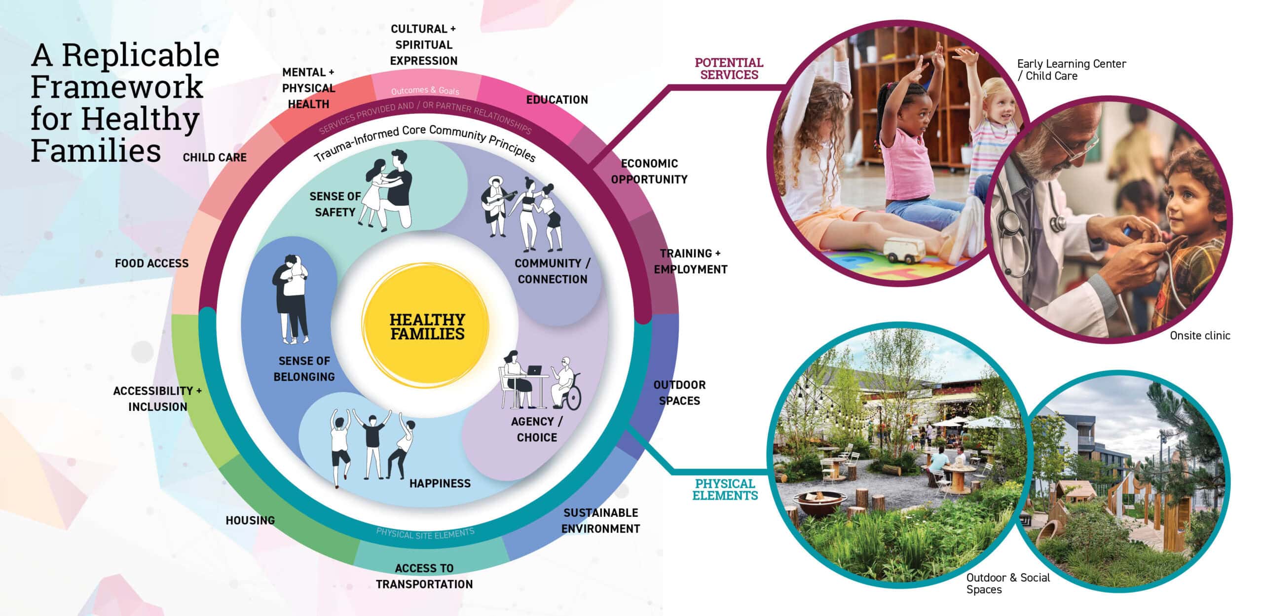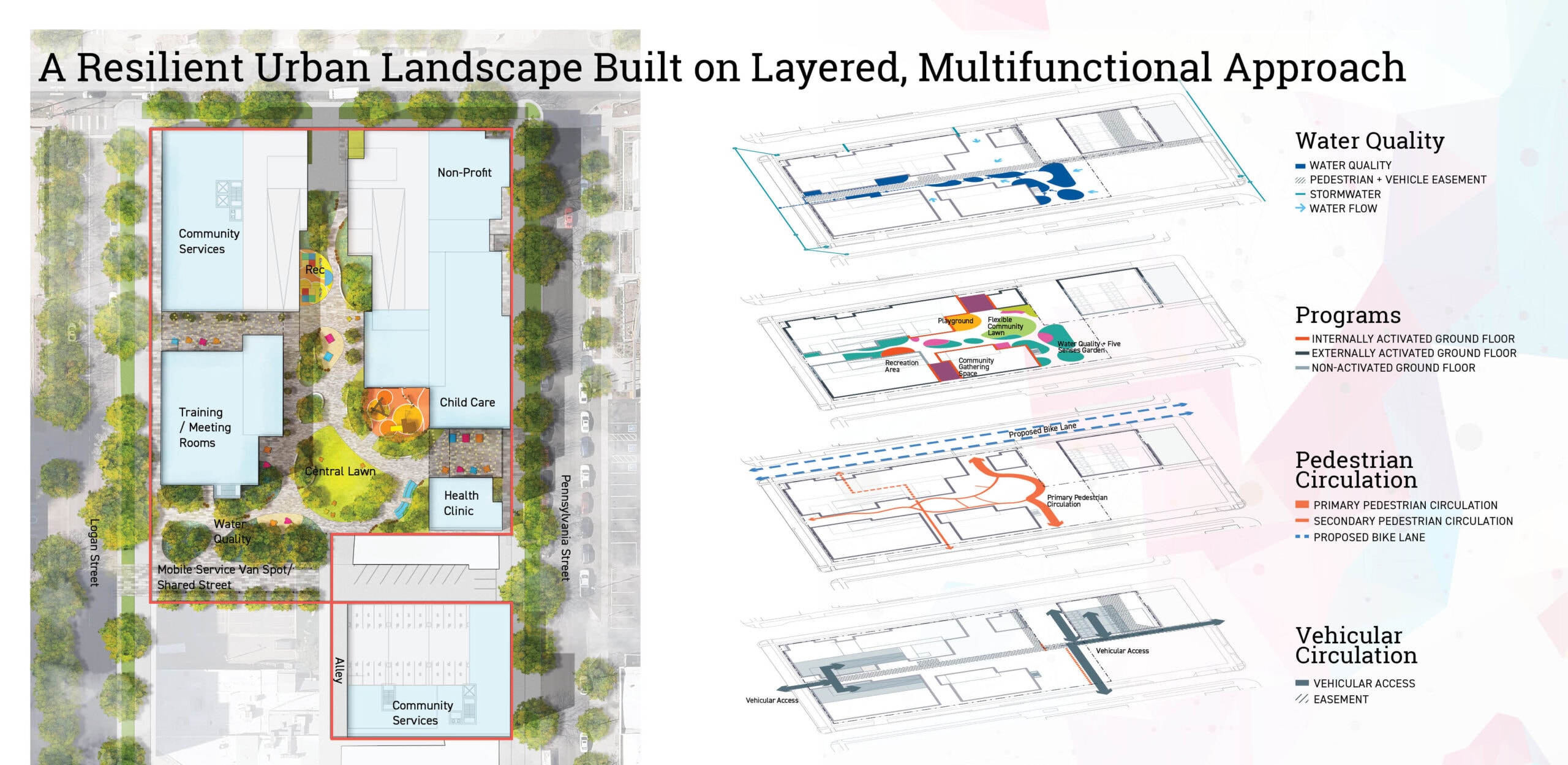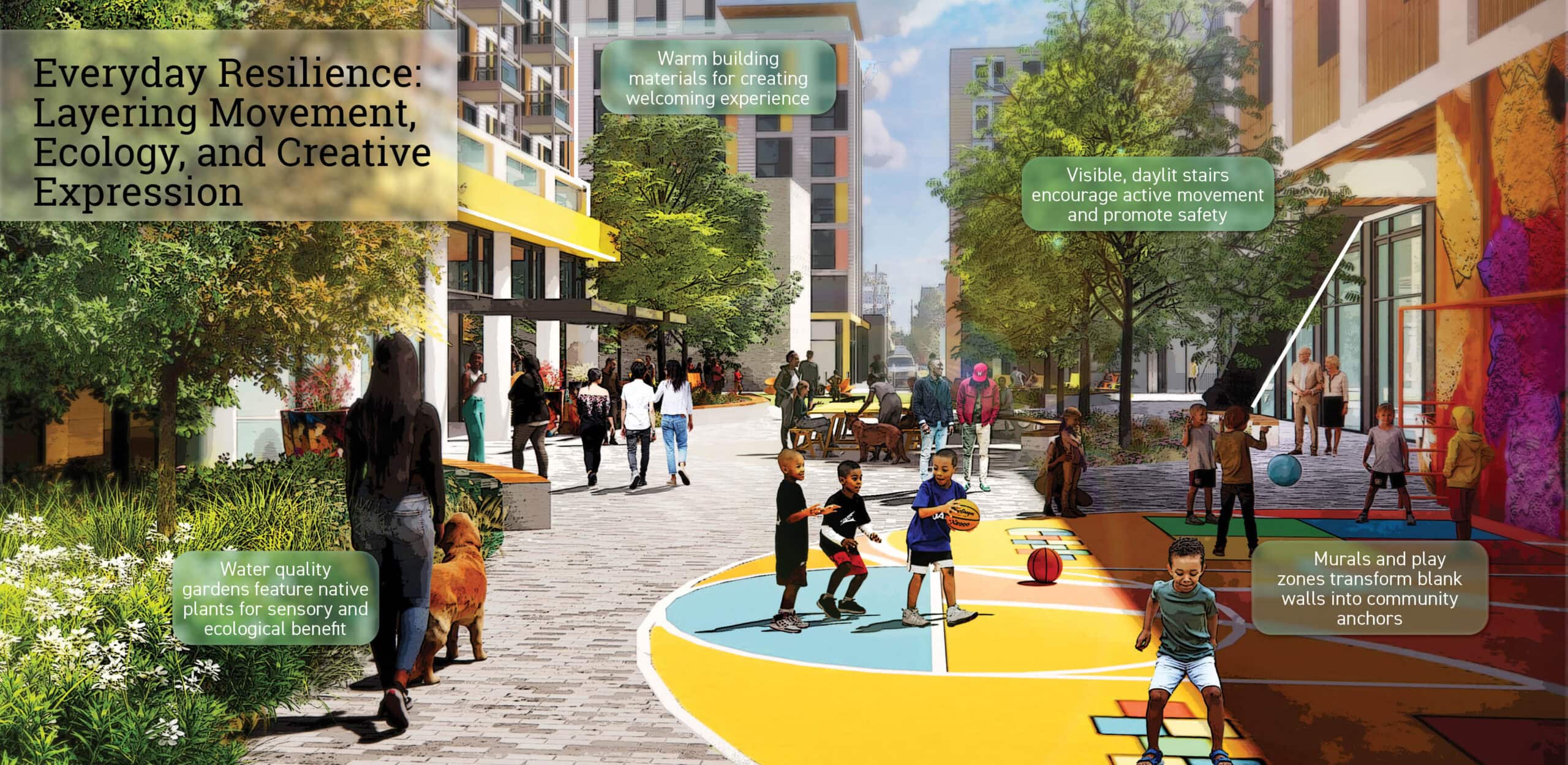 Centered on the needs of multigenerational households in an urban context, the plan fosters a neighborhood rooted in connection, opportunity, and resilience. The landscape architect led the development of a holistic framework that integrates physical site design with service-based programming, guided by five core planning principles: sense of safety, community/connection, agency/choice, happiness, and belonging. These values shaped every element of the design, from courtyard layouts and stormwater gardens to flexible gathering spaces and culturally responsive play environments.