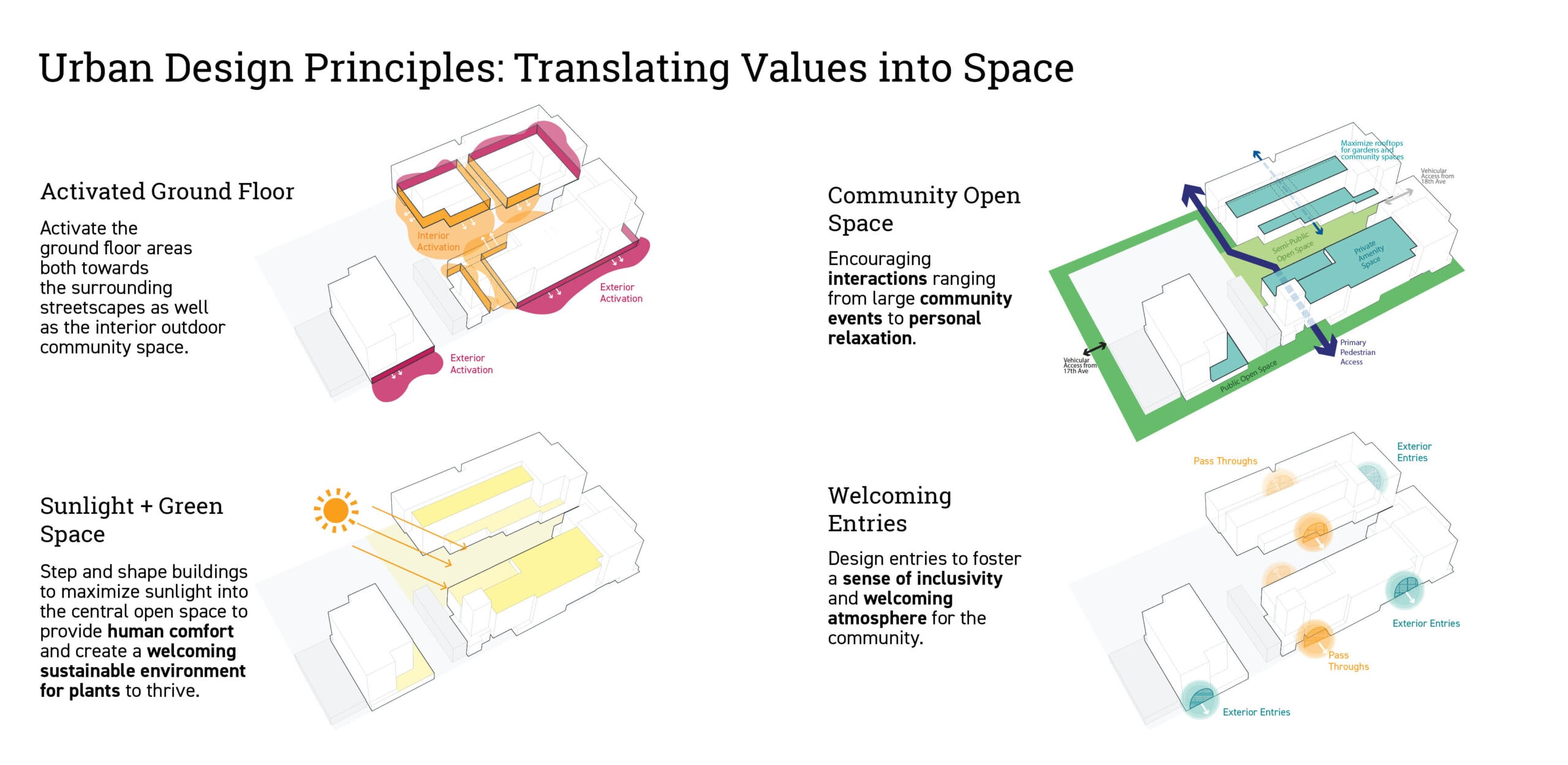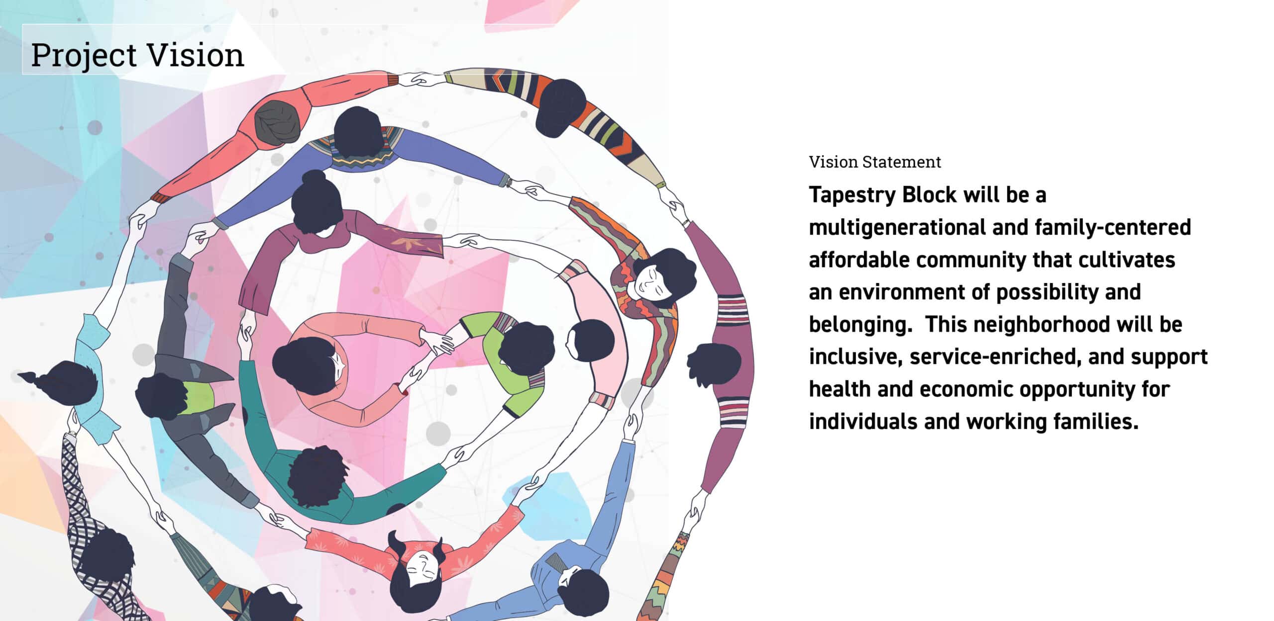 The Tapestry Block Vision Plan responds to this layered context by reclaiming a full city block for community well-being. The plan is intentionally woven into the neighborhood’s fabric, redefining the block not as an isolated development, but as an open, connected, and inclusive landscape that supports equity, access, and long-term resilience.