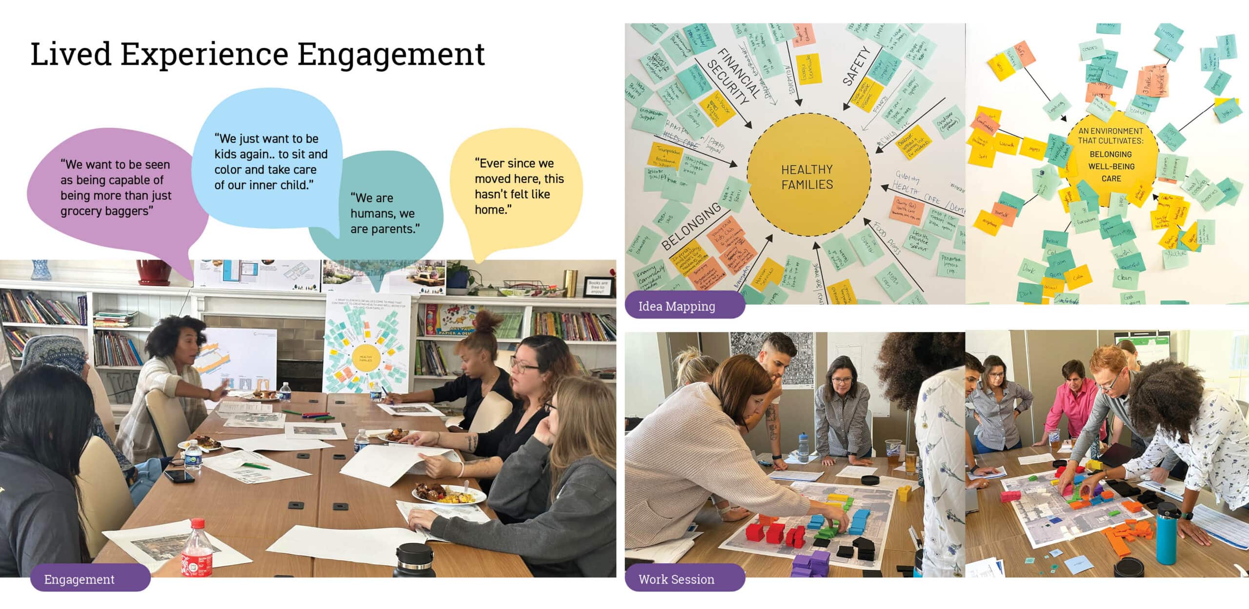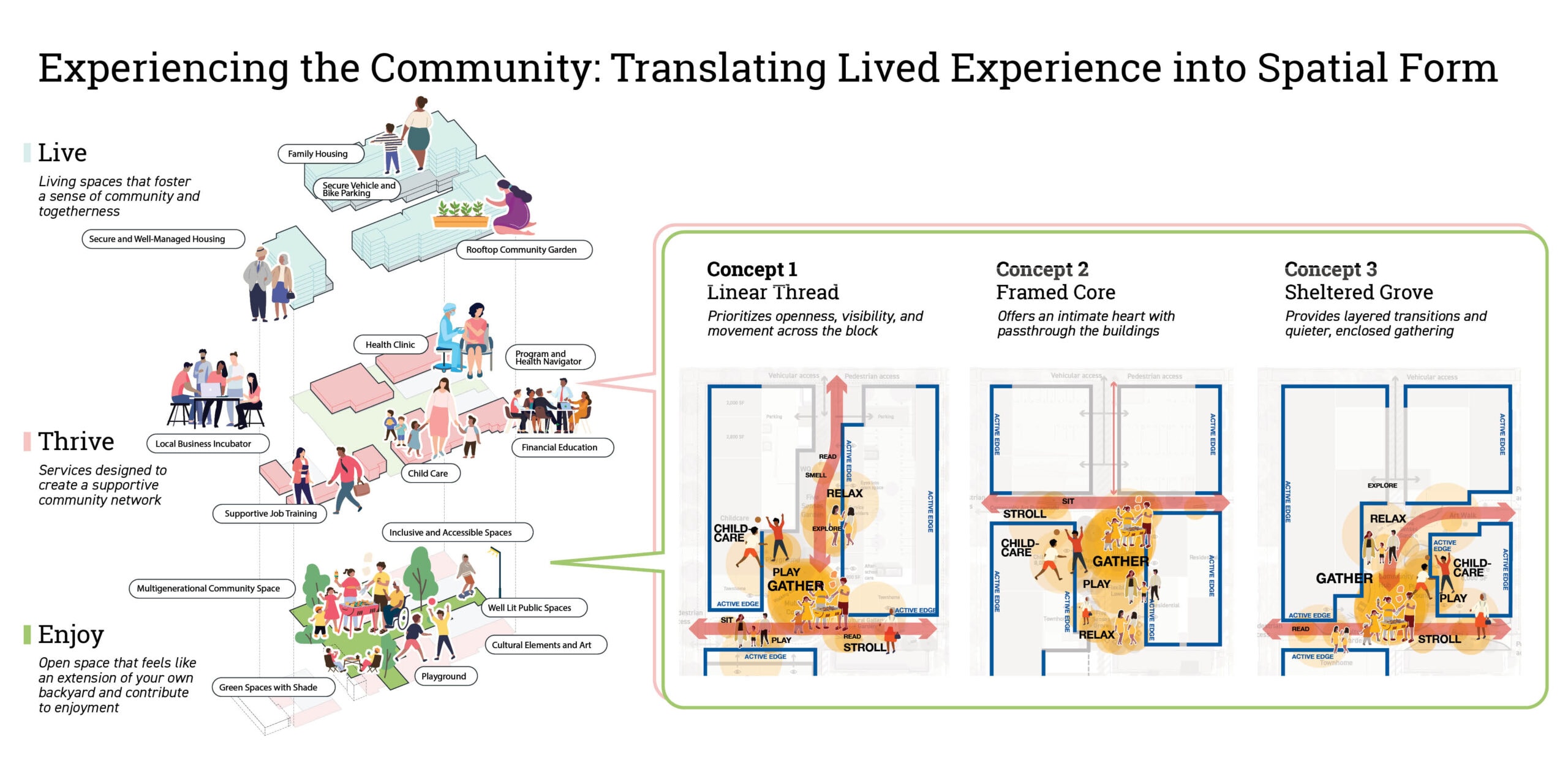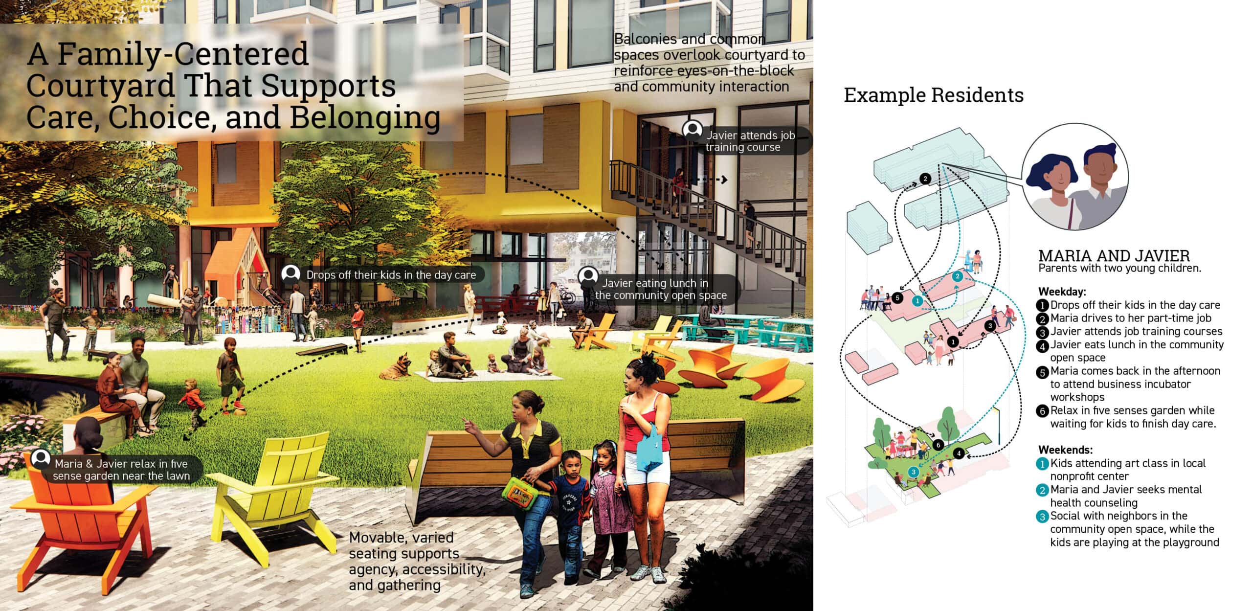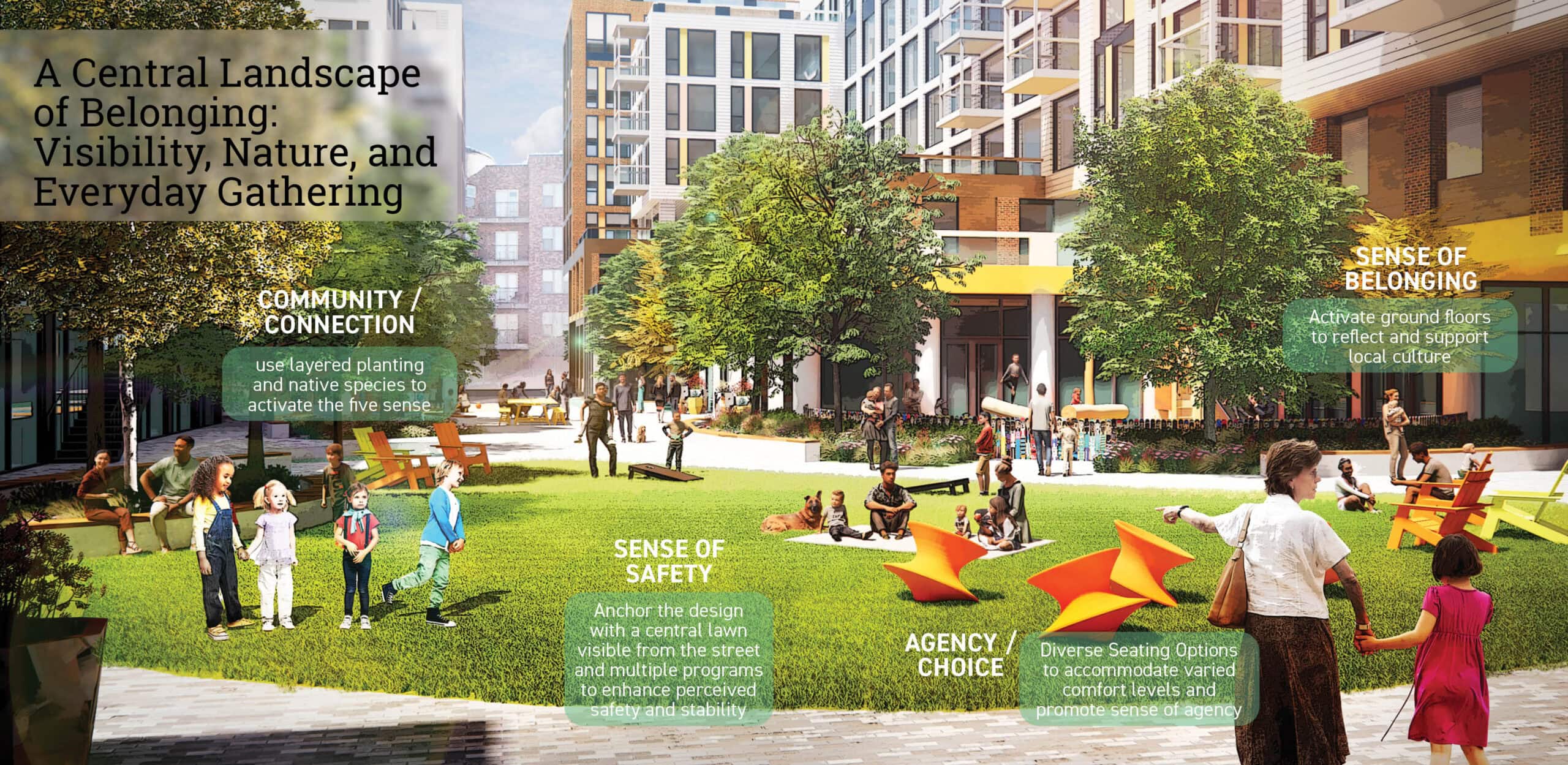 For the general public, especially families historically excluded from the urban core, this plan provides visibility, safety, and a sense of belonging. It counters the homogeneity of market-rate development, demonstrating what it means to design with communities rather than for them. Through direct engagement with future residents and service providers, the design team translated lived priorities into spatial strategies, such as a playground secured during childcare hours, community bulletin boards for shared storytelling and cultural expression, and a range of gathering typologies, from small, shaded alcoves for one-on-one connection to larger, flexible lawns that support informal play and cultural events.
