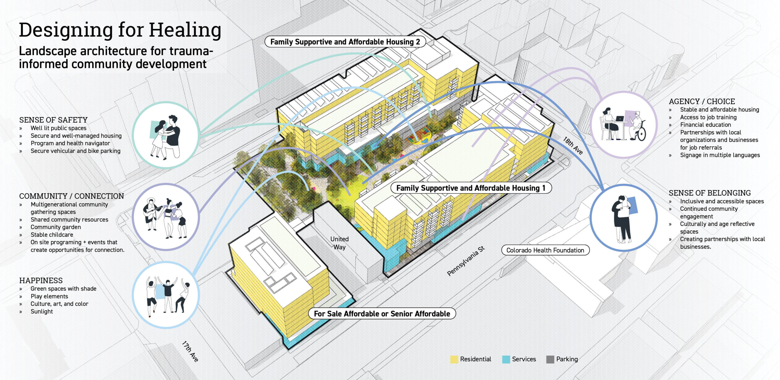 Environmental stressors are also acute: the site is located in one of Denver’s highest-risk heat zones, with limited tree canopy and expansive impervious surfaces. Public parks are sparse and under-programmed, and crossing major arterials to reach healthy food and education resources presents barriers.