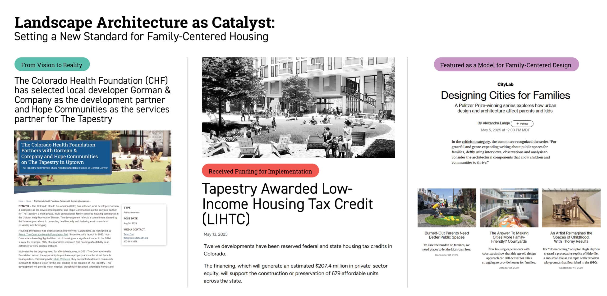 The Tapestry Block Vision Plan presents a bold, multidisciplinary approach to affordable housing that integrates the built environment with the full spectrum of social determinants of health, including access to nature, safety, mobility, social connection, and cultural belonging. This vision positions landscape architecture as a catalyst for systemic change, shaping not only access to shelter but the everyday conditions that influence public health, safety, and community well-being.